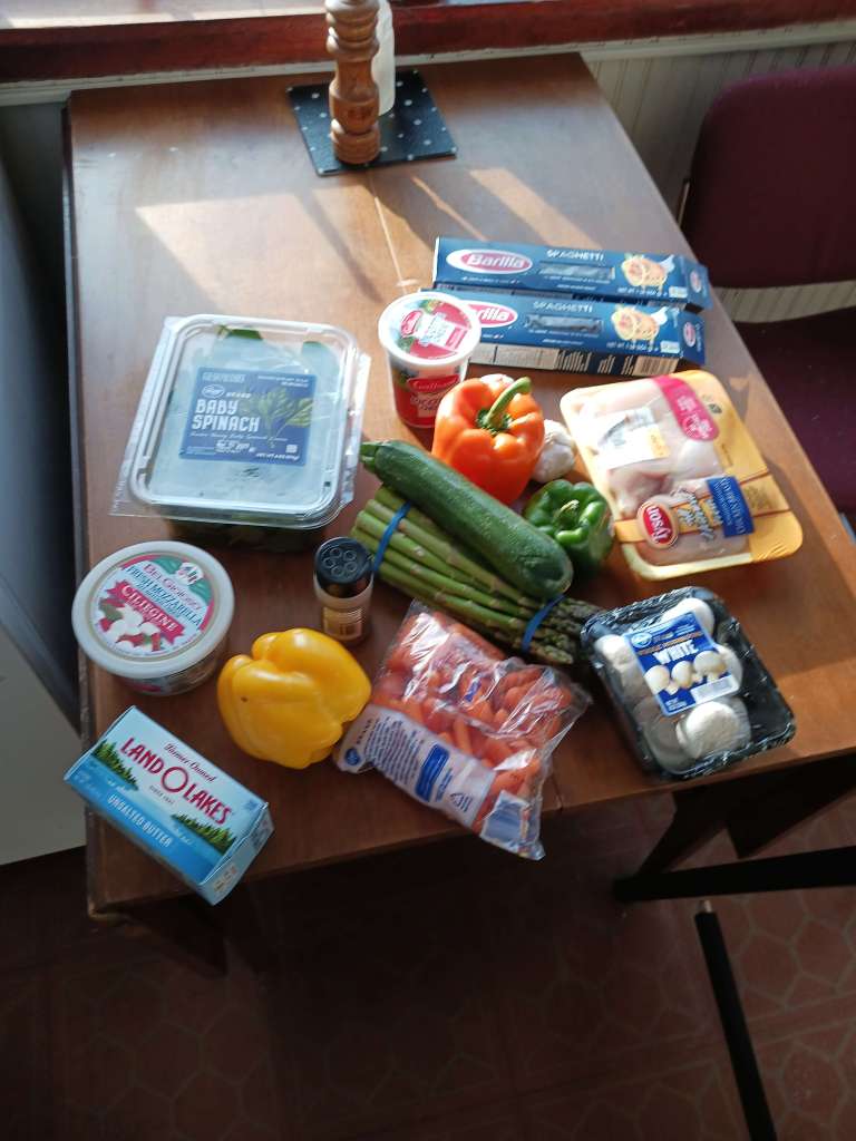 3. “1 box each” of an assortment of vegetables (Spinach, mushrooms, baby carrots, zuchini, green & orange & yellow capsicum, asparagus)