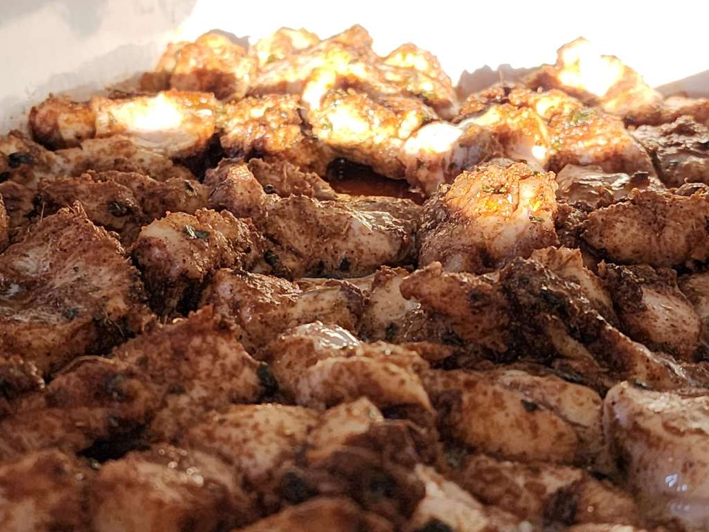5. Mix the chicken and spice mix and keep aside. Ideally leave it in the fridge for 2 hours, but we didn’t do that.