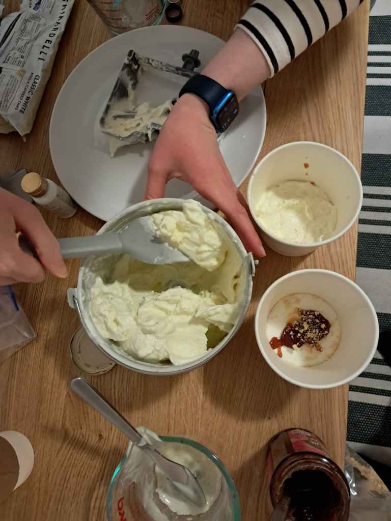 • Add the ice cream base to an ice cream machine. Let it do its thing till it’s ready. The ice cream should reach the consistency of a smoothie made of frozen things.
