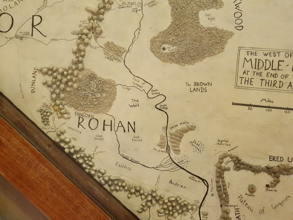A coffee table containing a 3D map of Middle-Earth, where the events of JRR Tolkein’s legendary Lord of the Rings Trilogy transpire.