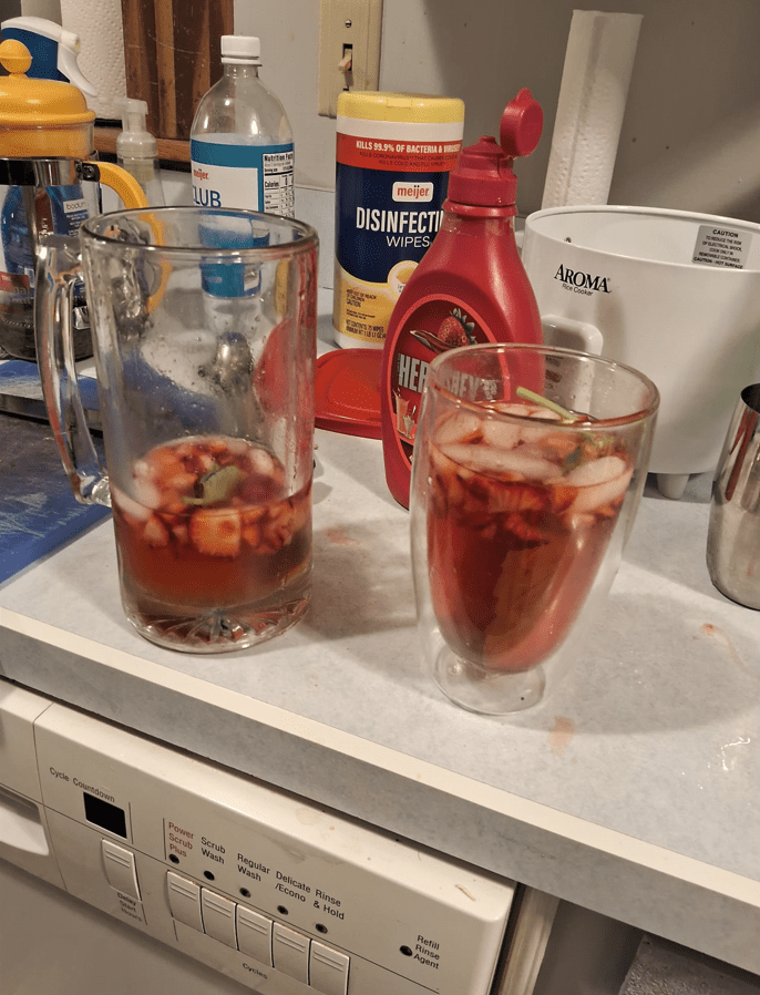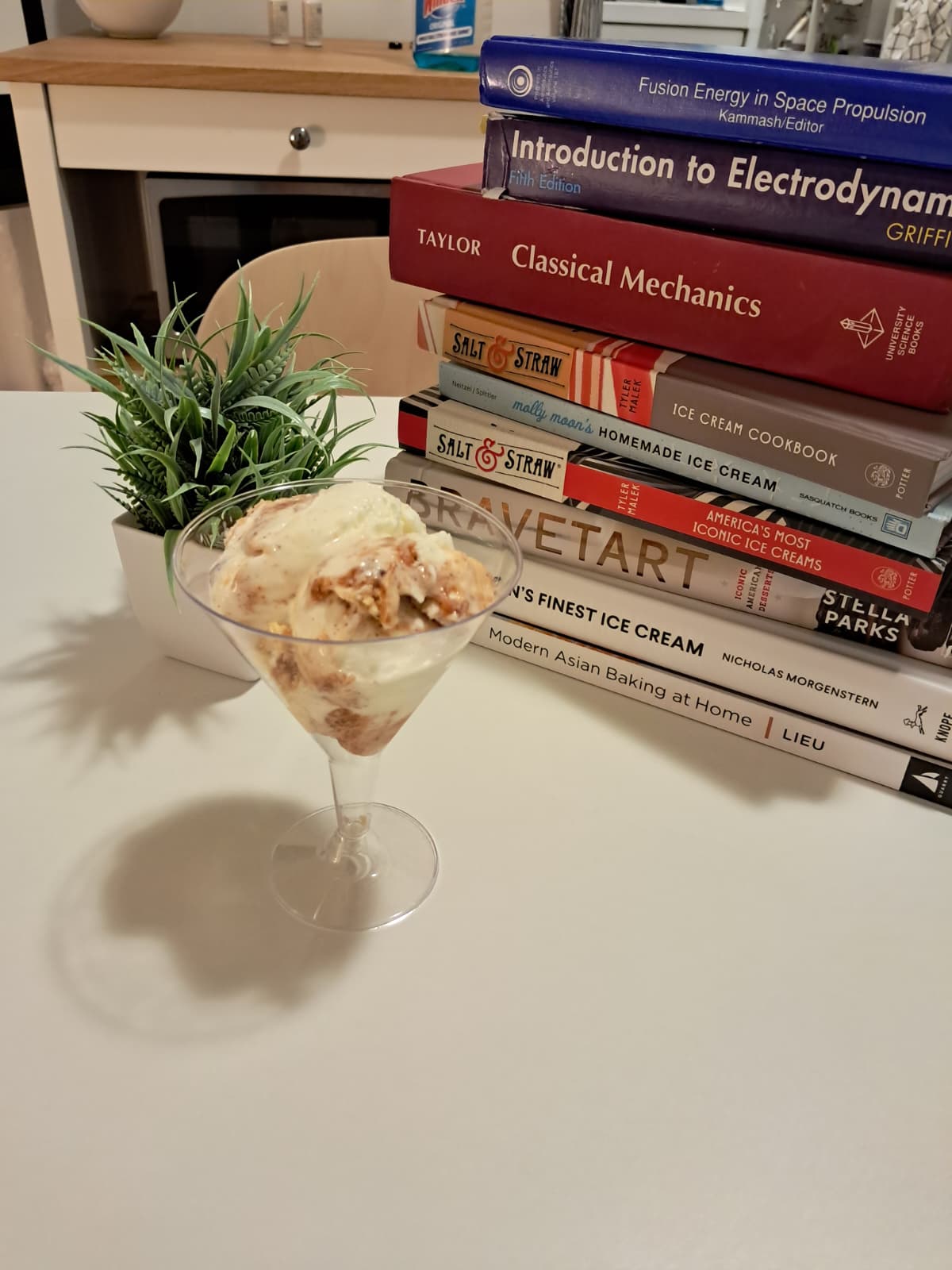 Two and a half pints of white chocolate vanilla ice cream with spiced raspberry swirls.